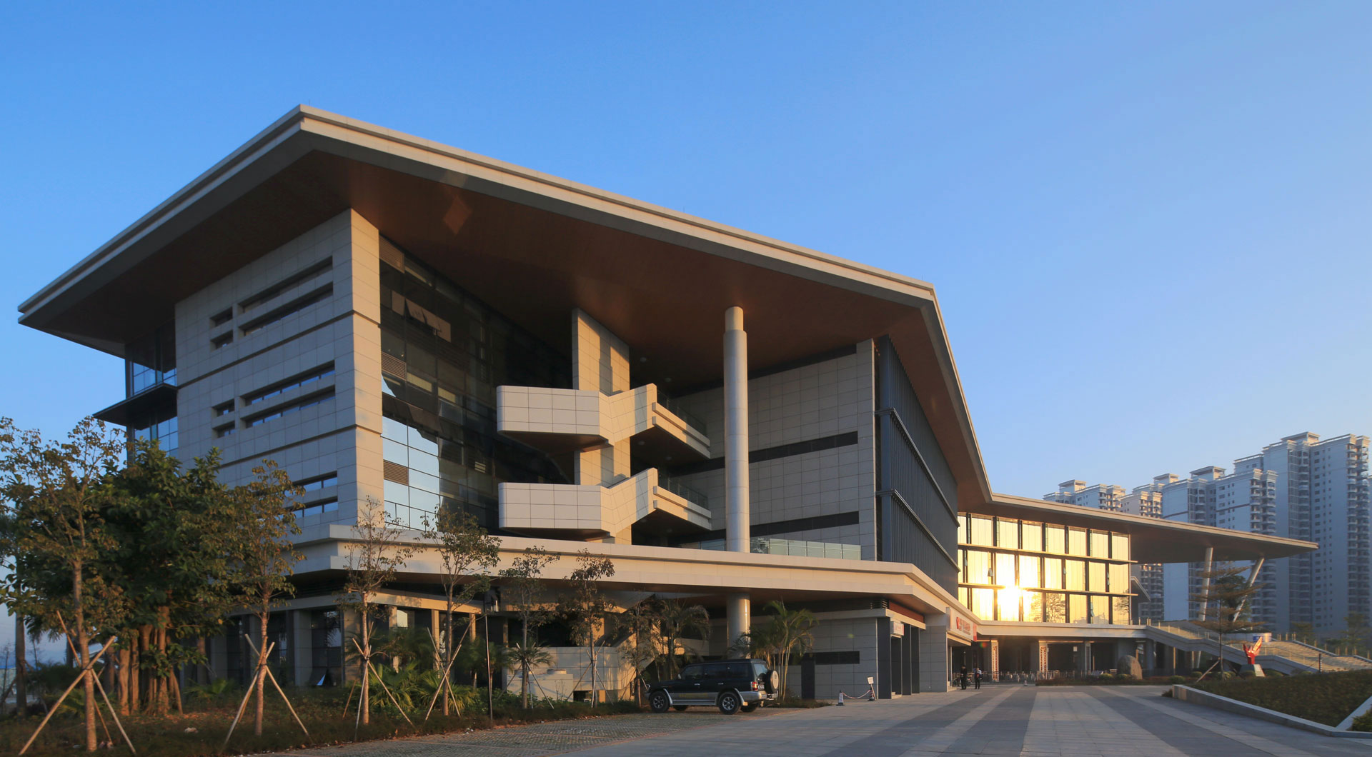 2017 Guangdong Province Excellent Construction Engineering Survey and Design Engineering Design Second Prize / Green Building Special Project Second Prize / Huizhou 2015 Annual Excellent Engineering Survey and Design First PrizeIn the design, the traditional monotonous and symmetrical government building style was abandoned, and the three principles of building openness, sharing, and ecology were emphasized. The entire building is arranged in an east-west direction broken line, which generates partial self-shielding and effectively reduces direct sunlight.Through the first floor overhead, roof greening, vegetation planting and the park mountain form a three-dimensional landscape space which becoming a part of the park. The open entrance design with large steps combined with large floating boards is used technically with a large-span steel structure to create a light and transparent space effect. The building is a green three-star building,with overhanging eaves, vertical striped glass, and sun-shading shutters on the building facade, forming a strong sense of shadow and rhythm.