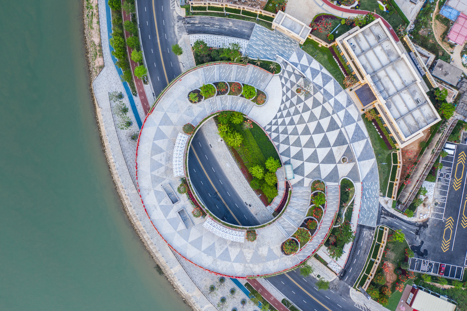 廣東省城鄉(xiāng)規(guī)劃設計研究院有限責任公司整體規(guī)劃在三江匯合處,建筑物回退形成廣場,并于此架設了城市陽臺,通過精心設計,以不同紋理的石材鋪裝,新穎的遮陽棚及坐凳、綠化的設置使之成為江門城鄉(xiāng)綠廊最出彩的節(jié)點;城市陽臺的后端,以精美的商業(yè)會所作為前部空間的收束,并與其后的板式樓王,形成一條空間景觀軸。