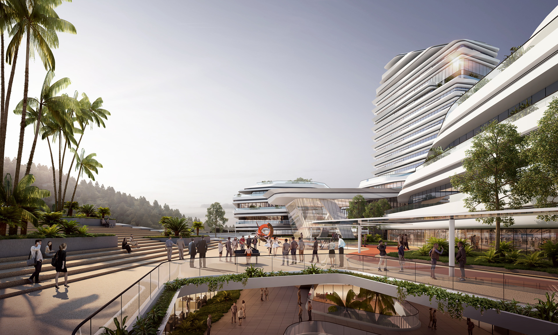 The characteristic Zhuhai mountains and rocks are selected as the design intention for the building. Ecological architectural treatment is adopted to weaken the volume and boundary of the building, and the civic center is built as a part of the city park. The second-story park uses the roof of the first-story building to expand the green area, combined with the large-space inclined roof to set up an open-air theater, uses the inclined wall to set up an interactive waterscape landscape, and set up several nodal landscape spaces to provide citizens with a wealth of activities.